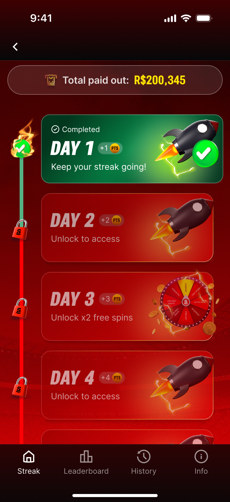 Daily challenges that compound. Players come back to keep their streak alive and chase the jackpot.